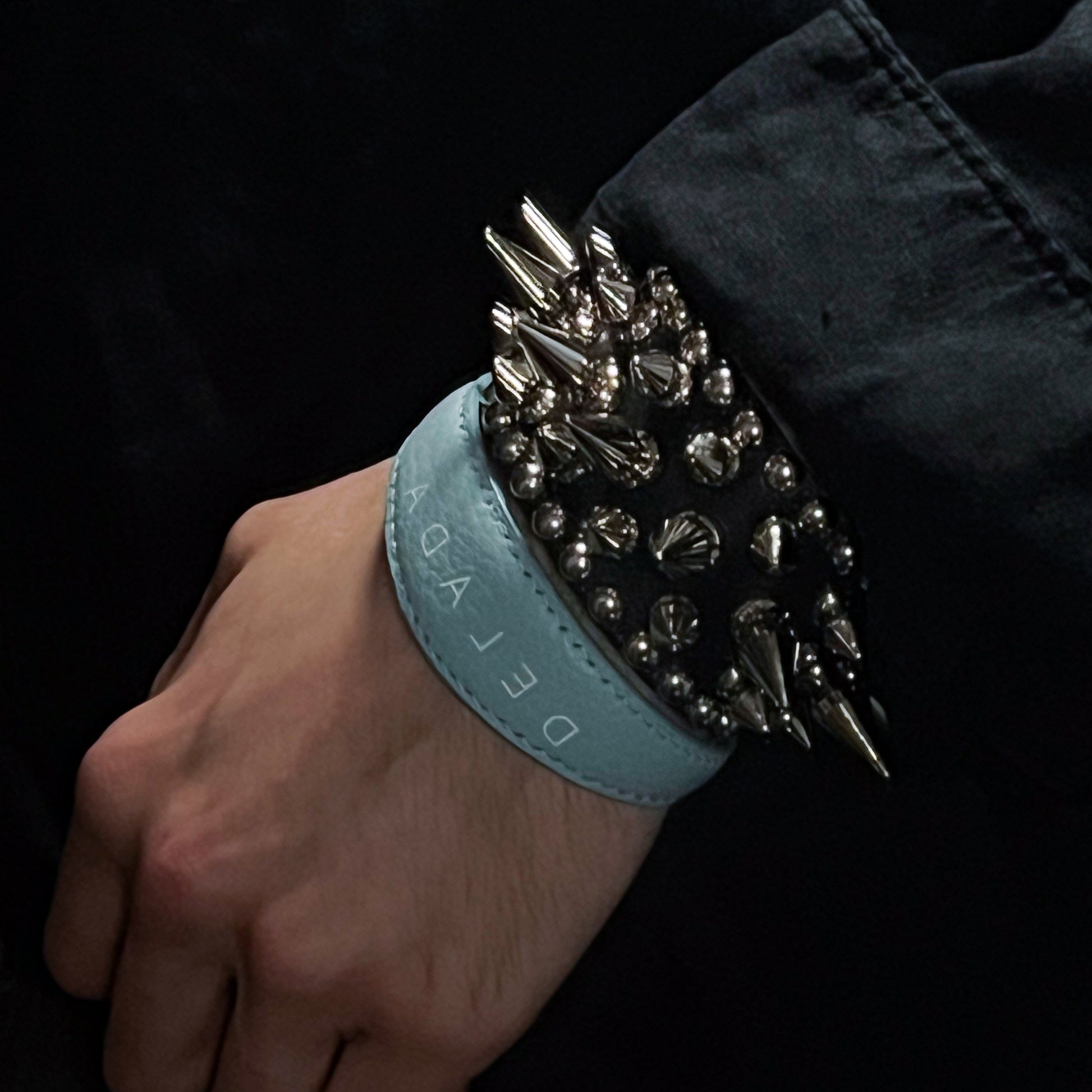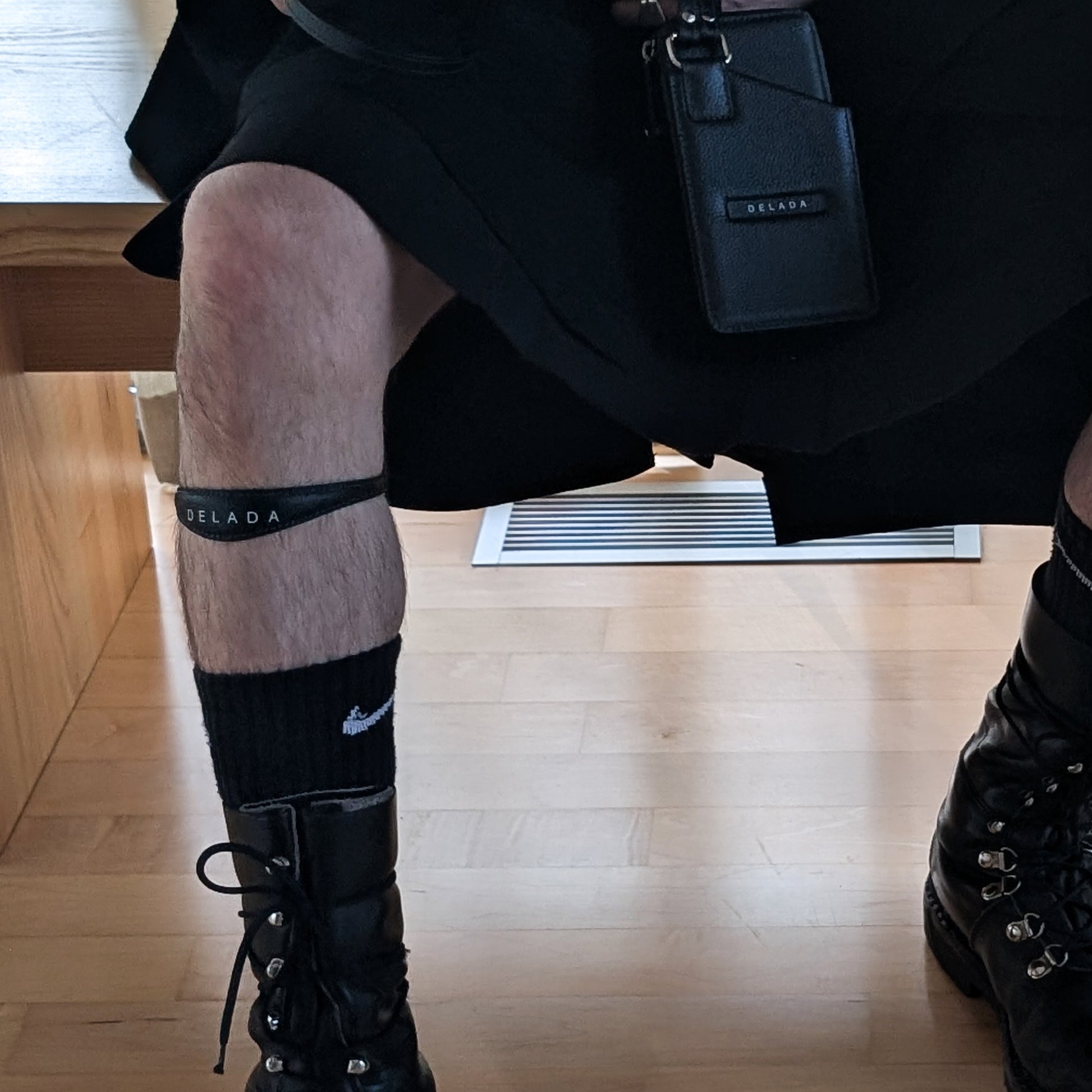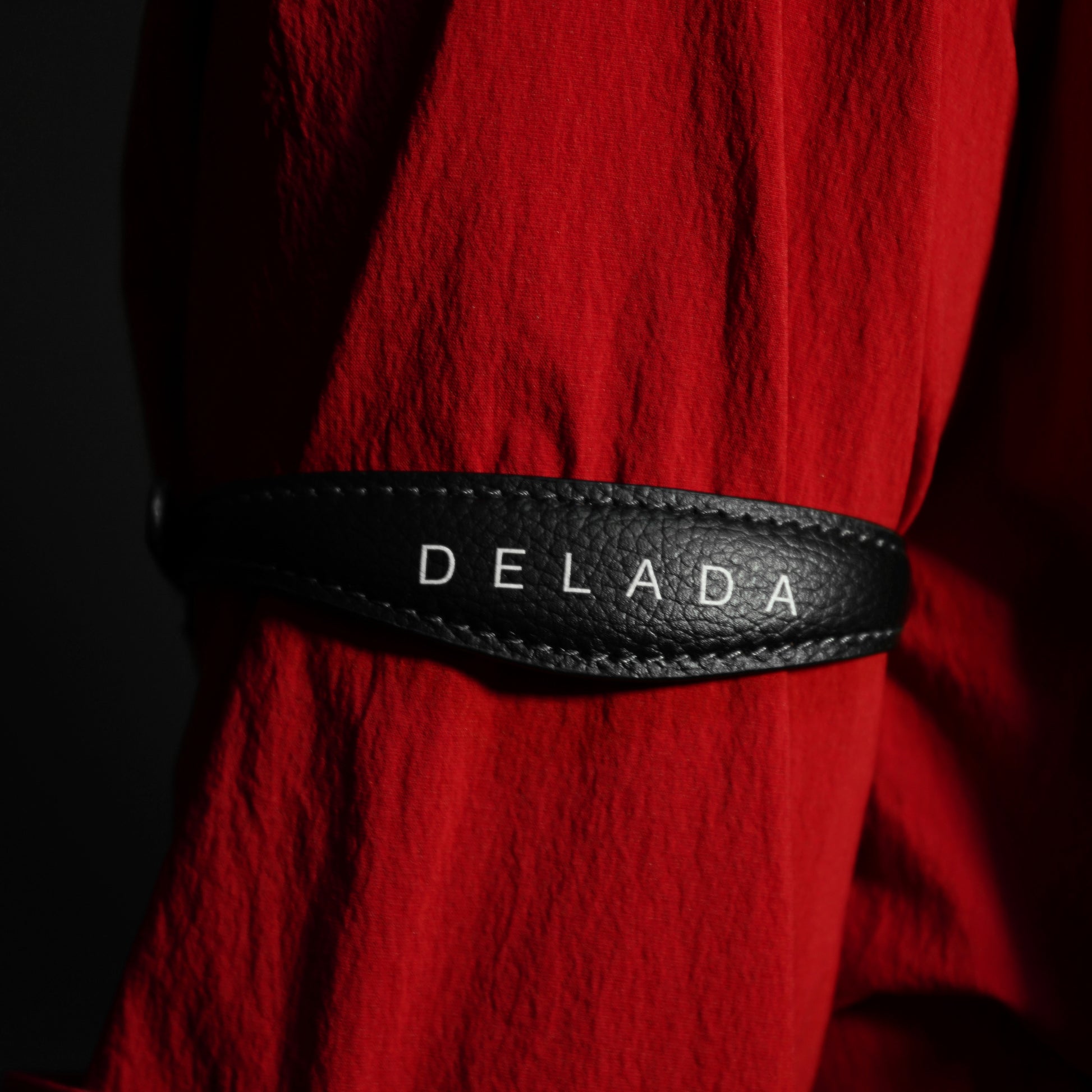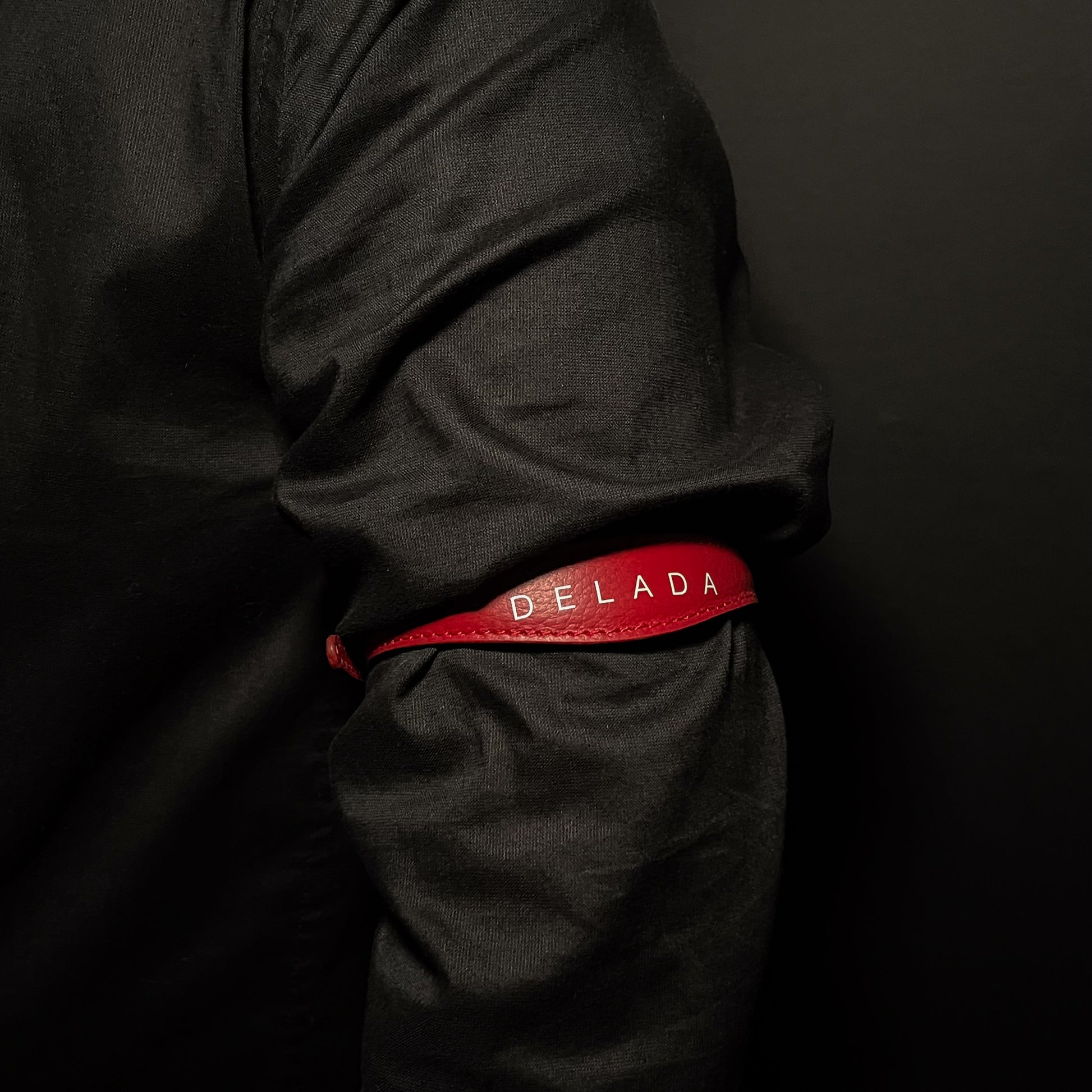 Our branded leather arm garter can worn on the arm to ruche your shirt, blazer, or sweater, around your calf, or even simply as a bracelet!